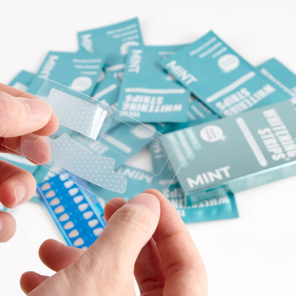 Place the strip on your teeth, gel side down, and align with the gum line.